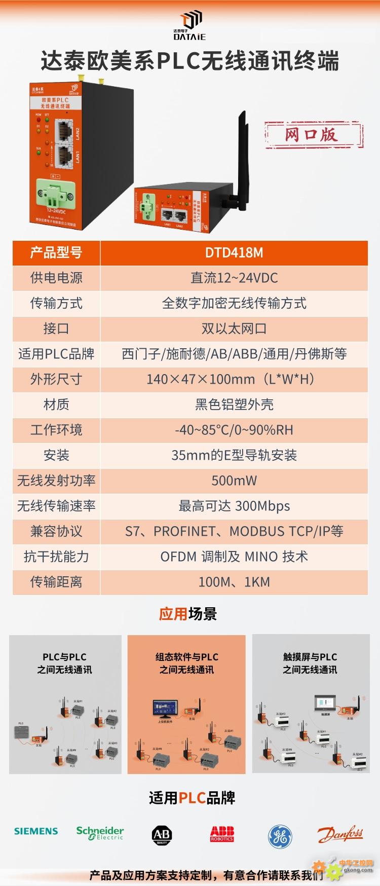 DTD418M 达泰欧美系PLC无线通讯终端,采用 2x2 两发两收无线架构,空中传输速率高达 300Mbps,兼容西门子S7协议、Profinet协议、Modbus TCP/IP等通讯协议,并采用 OFDM 调制及 MIMO 技术,使无线可靠传输距离达到1KM范围内均可使用。适用于西门子、施耐德、AB、ABB等欧美系PLC品牌。