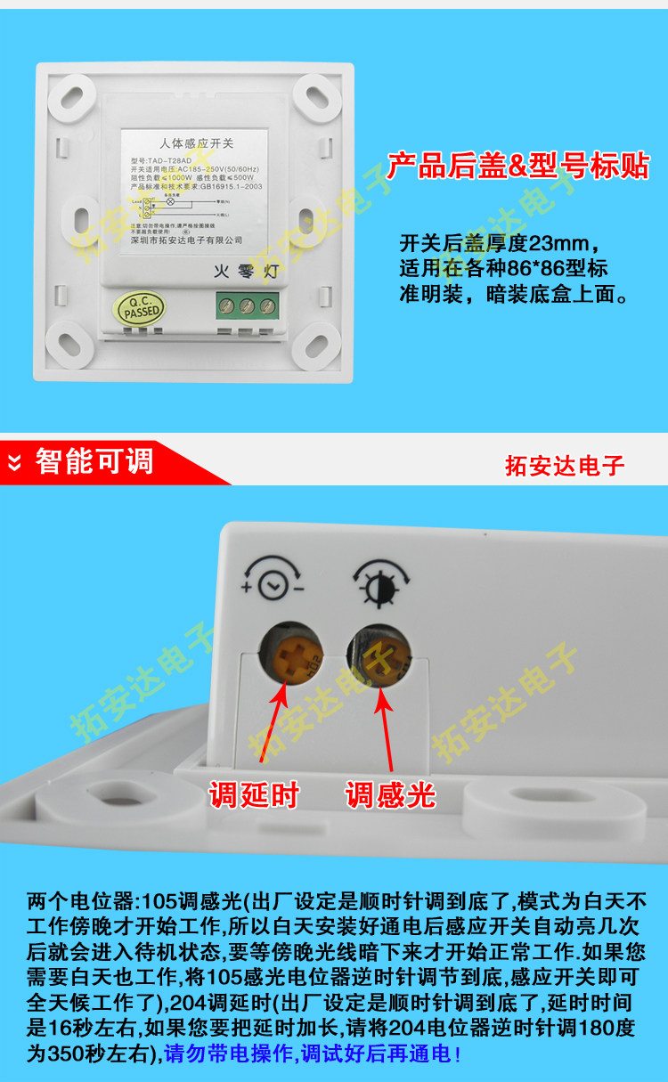 220V人体红外线感应开关节能灯LED灯可调延时感光大功率